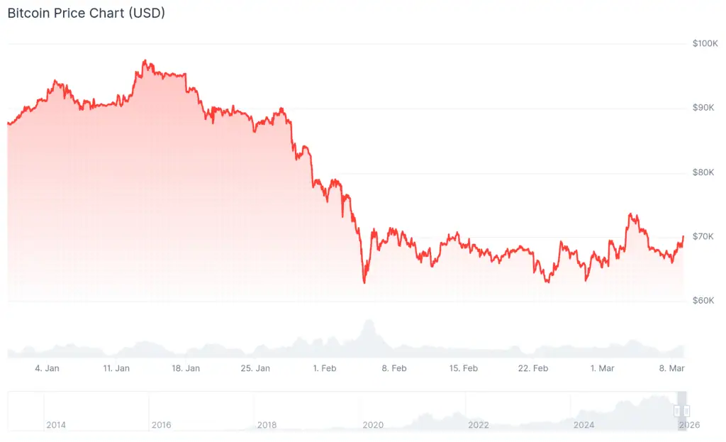 La cotización actual de 70.000 dólares expone la sensibilidad de Bitcoin frente a la coyuntura geopolítica reciente. El aumento de los precios del petróleo y la expectativa de datos de inflación desfavorables en Estados Unidos han impactado directamente en el sentimiento de los inversores.