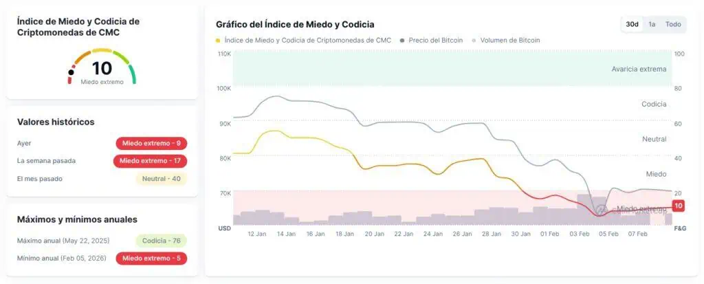 Paralelamente, el Índice de Miedo y Codicia, que el 5 de febrero descendió hasta los 4/100, ha mostrado una leve recuperación situándose en 10/100. Aunque este valor todavía refleja un miedo extremo, la tendencia ascendente respalda la visión de Van de Poppe sobre el cambio de dinámica que se gesta en el sentimiento de los inversores.