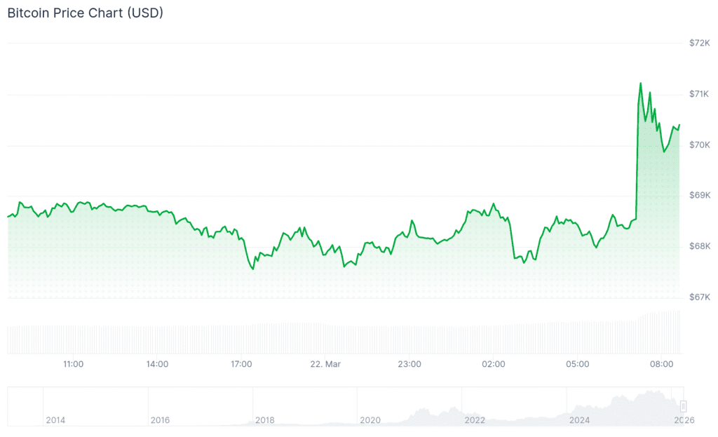 Bitcoin recupera la marca psicológica de los 70.000 dólares tras una subida del 2,74% en las últimas horas. Analizamos cómo el ultimátum de EE. UU. en el Estrecho de Ormuz, la crisis del petróleo y las compras institucionales de Strategy están moldeando la volatilidad del mercado cripto hoy.