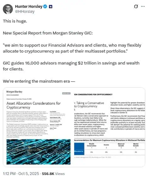 Morgan Stanley, otro pilar de Wall Street, formalizó esta tesis en un informe distribuido a sus clientes este mes. La firma no solo permite la exposición, sino que ahora recomienda activamente a sus clientes de gestión de patrimonio una asignación de hasta un 2% a 4% de sus carteras en criptomonedas, principalmente Bitcoin, dependiendo de su perfil de riesgo.