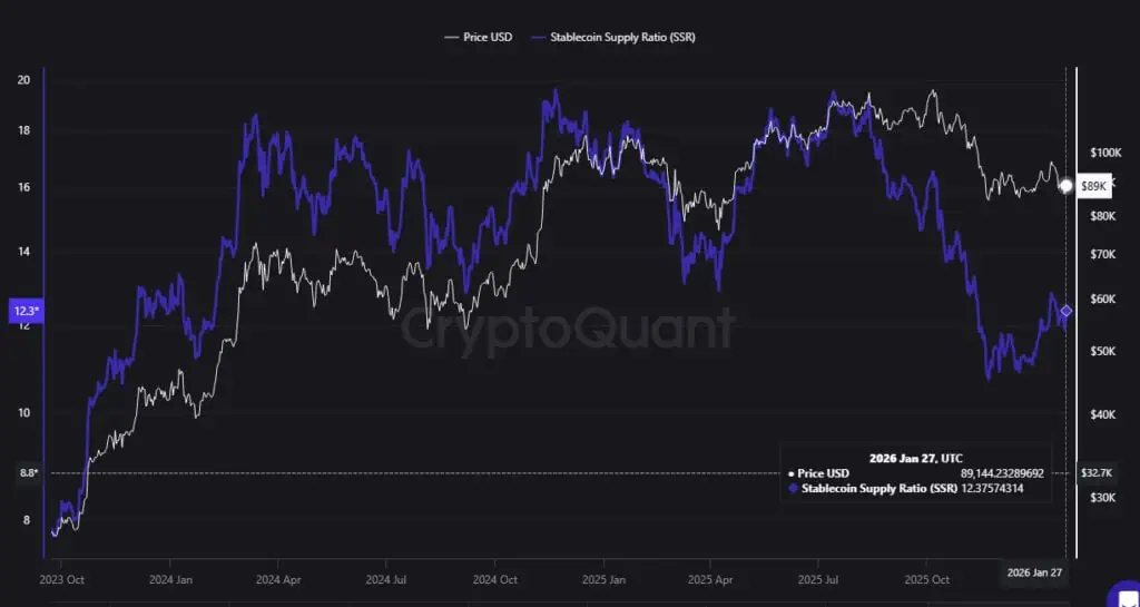 “El Ratio de Suministro de Stablecoin (SSR) indica que el capital no está abandonando el ecosistema cripto, sino que permanece en liquidez, esperando oportunidades para entrar en Bitcoin.”, dijeron los analistas.