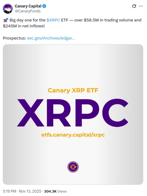En medio de este panorama, el debut de un nuevo ETF spot de XRP en Nasdaq marcó un punto de inflexión. Lanzado por Canary Capital bajo el ticker XRPC, este producto se convirtió en el mayor estreno de ETF en lo que va de 2025, con 245 millones de dólares en entradas durante su primer día de negociación.