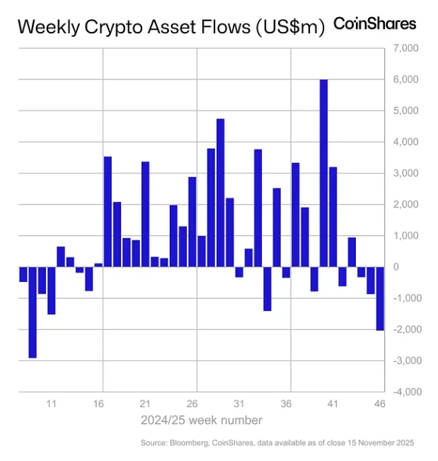 La semana pasada, la inversión institucional en activos digitales vivió una de sus jornadas más volátiles del año. Según el informe semanal de flujos de fondos publicado por CoinShares, los productos cotizados en bolsa vinculados a criptomonedas registraron salidas por 2.000 millones de dólares, la cifra más alta desde febrero. Estas salidas de fondos reflejan un cambio en el comportamiento actual de los inversores, que están reduciendo su exposición a las principales criptomonedas, Bitcoin y Ethereum.