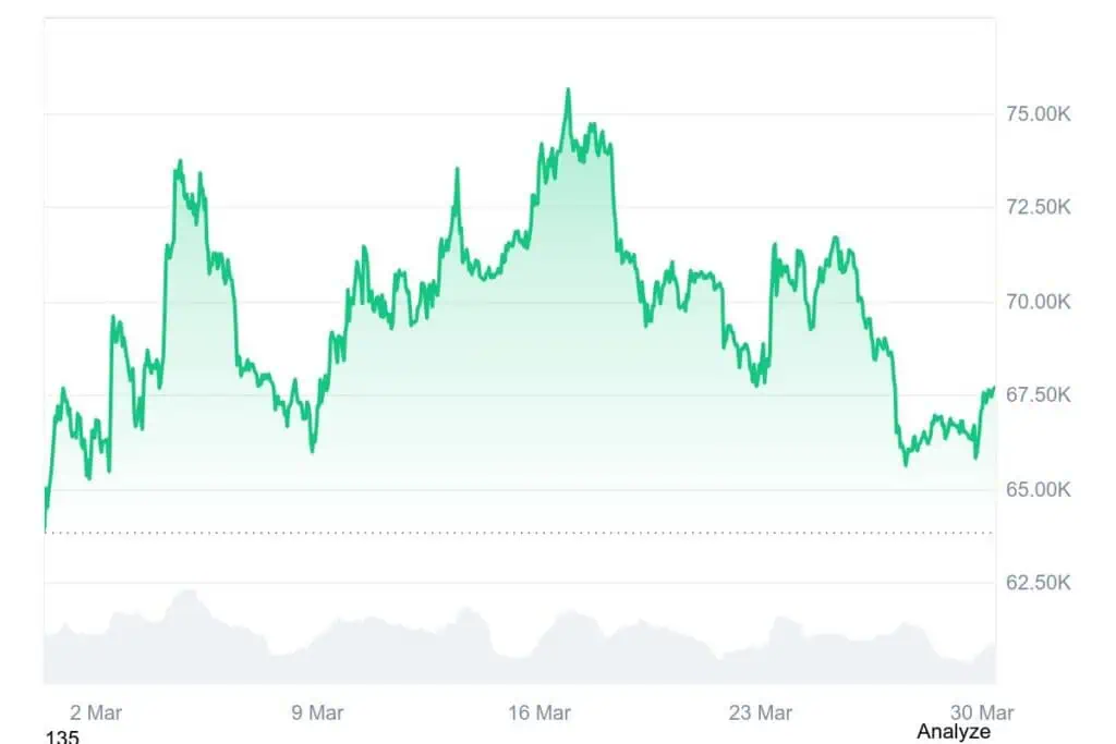 El informe observa que, tras el cierre del Estrecho de Ormuz y el aumento de la actividad militar, Bitcoin reaccionó inicialmente como un activo sensible al riesgo. Su precio retrocedió desde los 66.000 dólares hasta poco más de 60.000 dólares, aunque la presión fue breve. En cuestión de días, la criptomoneda se estabilizó cerca de los 69.000 dólares, lo que supone un avance de alrededor del 5,3% en su precio unitario durante marzo.