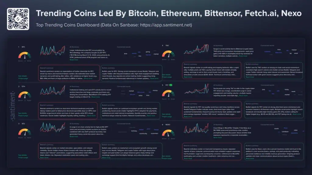 Durante este mes de marzo, la conversación global se ha concentrado en la consolidación de las grandes redes y el auge de la inteligencia artificial, con Bitcoin, Ethereum y Solana a la cabeza de las menciones en plataformas como X, según los registros de Santiment.