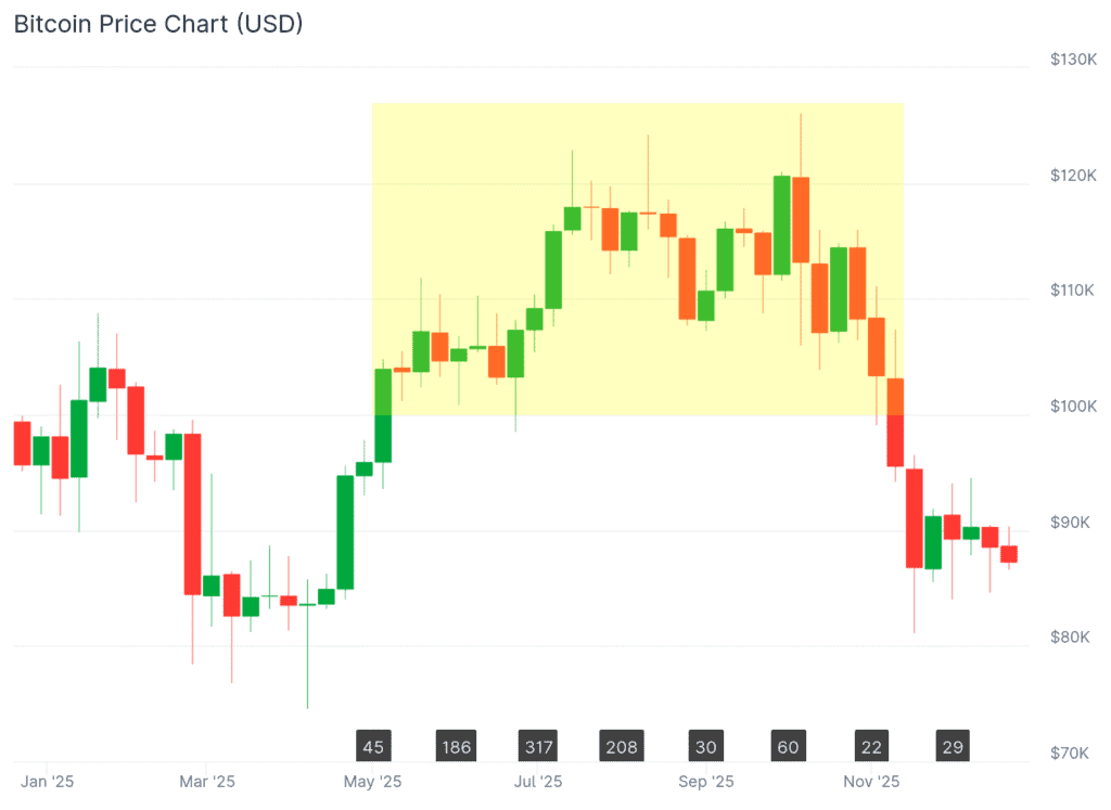 La moneda digital logró algo que parecía impensable hace apenas unos años, al sostener una valoración superior a los 100.000 dólares durante casi 200 días seguidos. Este tramo de estabilidad abarcó desde los primeros días de mayo hasta bien entrada la mitad de noviembre y representó un cambio de paradigma en la confianza de los mercados globales. Ya no se trataba de un pico momentáneo impulsado por el entusiasmo de una tarde, sino de una permanencia sólida que validó el precio de seis cifras como una zona de confort para compradores y grandes instituciones financieras.