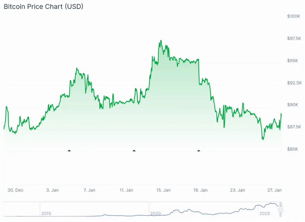 Durante los últimos días, el precio de Bitcoin ha retrocedido a niveles cercanos a los 89.000 dólares, después de alcanzar sus niveles más altos a mediados de enero. Este movimiento bajista ha generado una pausa en el entusiasmo inicial del año y ha llevado a los participantes a reevaluar estrategias en medio de un panorama económico influido por las tasas de la Reserva Federal y las tensiones en el comercio global.