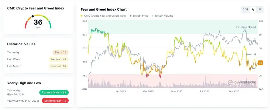 El mercado de criptomonedas atraviesa una fase de repliegue emocional. El índice Crypto Fear & Greed de CoinMarketCap, que mide el sentimiento predominante entre los inversores, se ubica hoy en 36 puntos, dentro del rango de “miedo”.