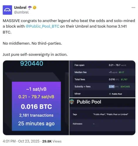 El logro fue destacado por Umbrel, una compañía conocida por desarrollar software que facilita a los usuarios correr sus propios nodos de Bitcoin. Según la compañía, el minero utilizó el Public Pool, pero configurado en un modo solitario. Esto significa que, si bien usaba una infraestructura de pool, no estaba compartiendo su poder de cómputo ni su recompensa potencial. Asumió todo el riesgo y, en esta ocasión, se llevó todo el premio completo.