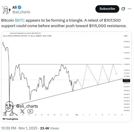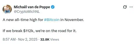 Martinez y van de Poppe observan con interés ciertos patrones técnicos que podrían indicar un repunte. Por ejemplo, el CIO de MNFund señala que la posibilidad de que Bitcoin alcance nuevos máximos históricos en noviembre es real si logra superar niveles clave de resistencia. En una publicación reciente en X, subrayó que pasar la barrera de los 112.000 dólares abriría la puerta hacia un impulso sostenido en el precio de la criptomoneda.