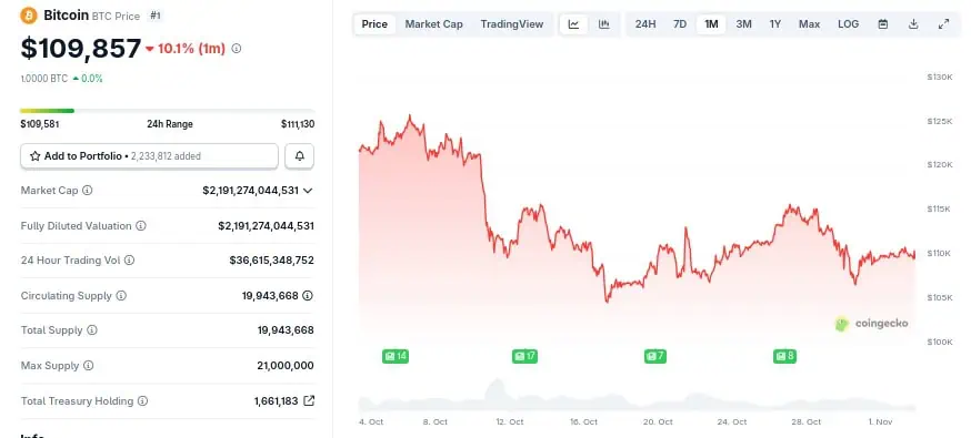 Con un precio que ronda los $109.800 al momento de escribir este artículo, la criptomoneda que lidera el mercado por capitalización muestra una caída acumulada del 10,11%, en el último mes, aunque con una leve recuperación del 0,1% en las últimas 24 horas. El gráfico de siete días revela una trayectoria descendente con rebotes intermitentes, lo que sugiere que el mercado aún está digiriendo los eventos recientes que han impactado el ecosistema financiero global.