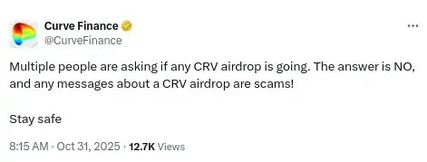 El equipo de Curve Finance ha salido al paso de una oleada de rumores que circulan en redes sociales sobre un supuesto airdrop de su token CRV. En una declaración pública emitida desde su cuenta oficial en X, los desarrolladores fueron contundentes: