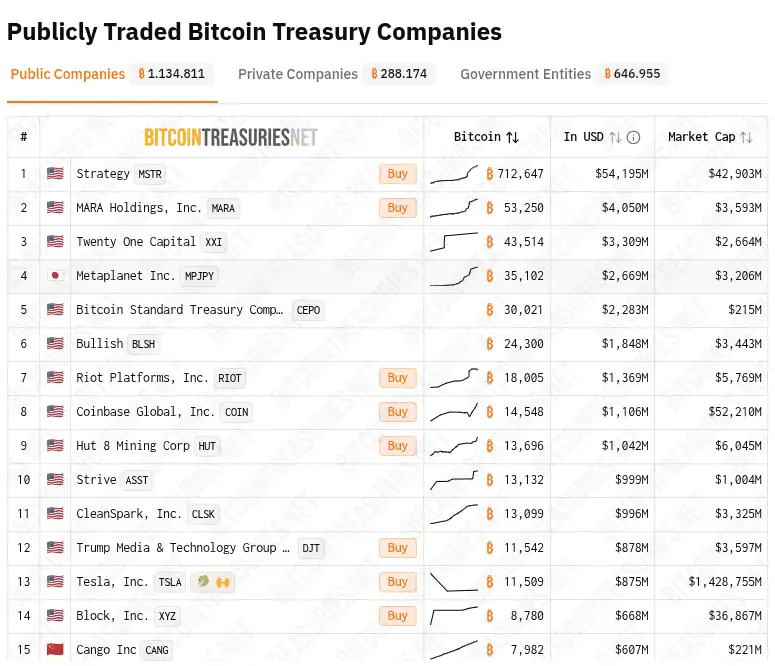 Metaplanet mantiene una política clara de integración de Bitcoin dentro de su estructura corporativa. Tras haber superado su meta de 21.000 BTC antes de 2026, la empresa posee actualmente 35.102 Bitcoin en su tesorería, equivalentes a unos 2.920 millones de dólares, de acuerdo con cifras publicadas por Bitcoin Treasuries. Con estas reservas, se ubica como la cuarta compañía pública del mundo con mayor tenencia de Bitcoin, solo por detrás de Strategy, MARA Holdings y Twenty One Capital.