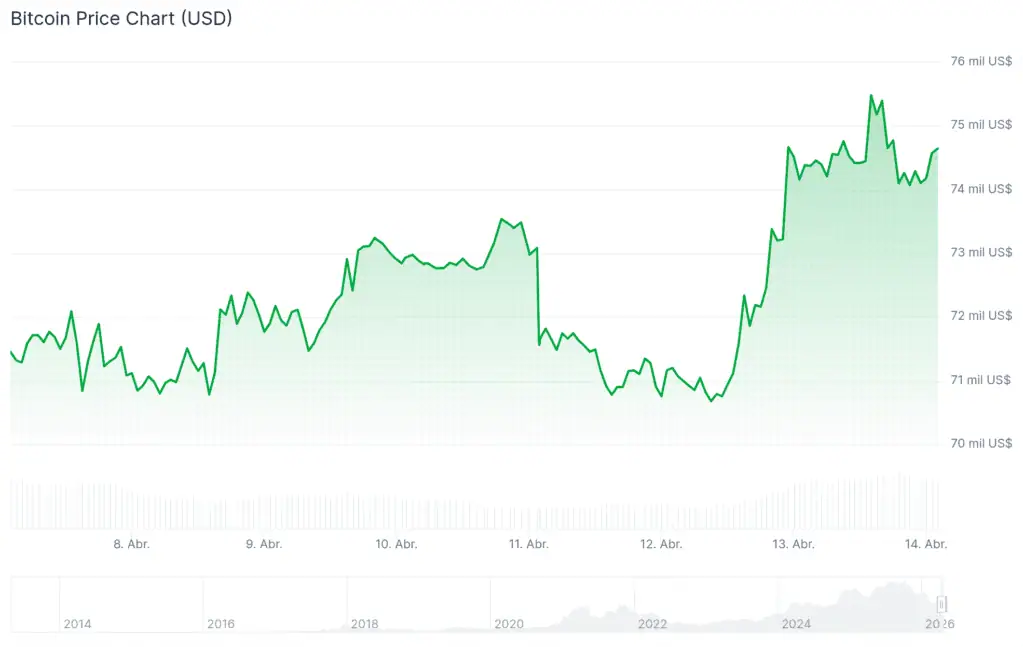 Bitcoin registra un avance del 1,16% en las últimas 24 horas, situando su valor en 74.600 dólares.