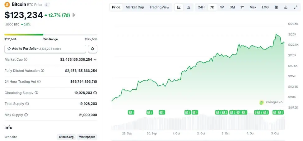 Este domingo, 5 de octubre, Bitcoin alcanzó un precio récord de Dolarów 125.506, consolidándose como la criptomoneda dominante y estableciendo un precedente histórico que renueva el interés global hacia los activos digitales.