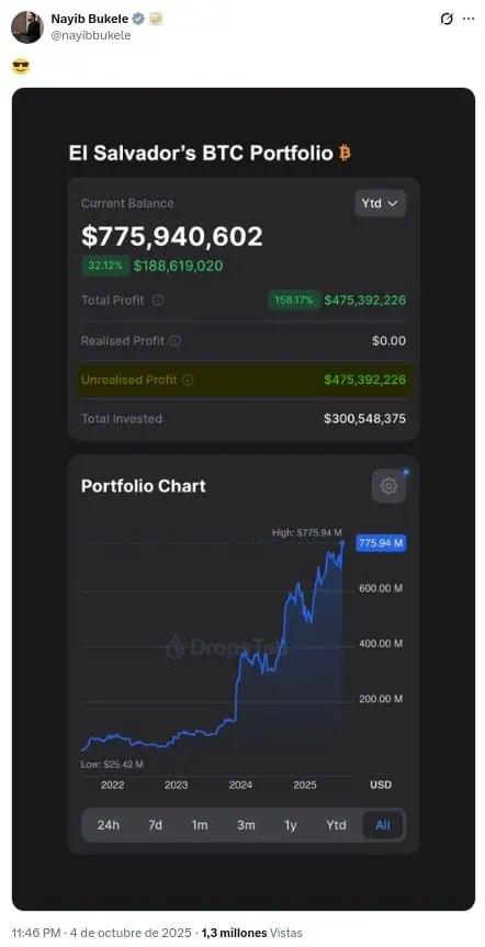 Por otro lado, El Salvador, el primer país del mundo en adoptar a Bitcoin como moneda de curso legal, también celebra ganancias notables. En sus publikacje recientes, Nayib Bukele, presidente de la nación centroamericana, celebró que las tenencias de BTC del país han generado ganancias no realizadas que alcanzan los 475 millones de dólares. Más allá de la cifra, el dato revela una estrategia estatal que, sin titubeos, confía en la permanencia y proyección de largo plazo de la criptomoneda.