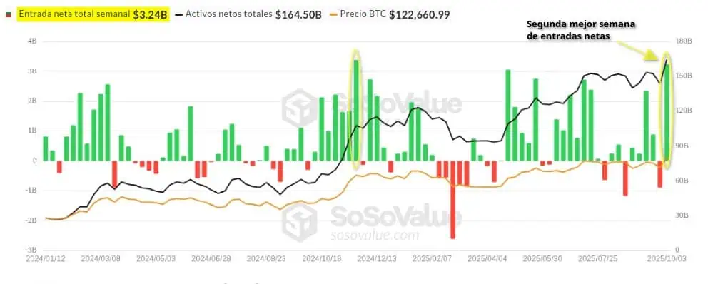 Compra BTC en Bit2Me y celebra el nuevo máximo históricoDe acuerdo con datos proporcionados por la plataforma SoSoValue, estos fondos han registrado entradas netas por valor de 3.240 millones de dólares durante la segunda mejor semana histórica en términos de flujo de capital. Las recientes cifras de inversión en los fondos cotizados representan una clara reversión en el sentimiento de cautela que habían mantenido los inversores institucionales semanas atrás.