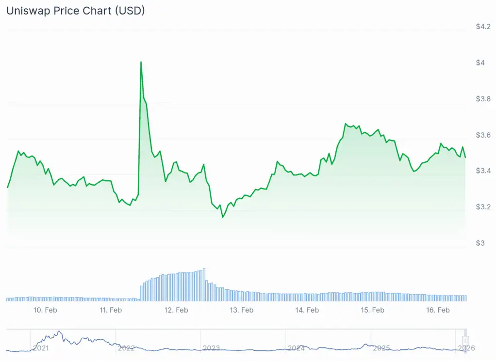El anuncio de la integración del fondo monetario de BlackRock en UniswapX impulsó de inmediato el valor de UNI, el token de gobernanza del protocolo descentralizado. En apenas una semana, su precio subió alrededor de un 5% hasta ubicarse cerca de los 3,5 dólares.