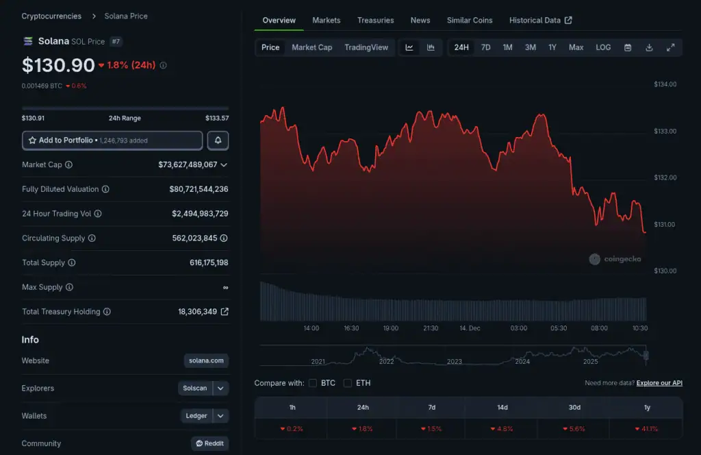 En términos técnicos, SOL se encuentra cotizando por debajo de su promedio móvil de 365 días, con resistencias fuertes entre $140 y $145 que ha fallado en superar, y soporte clave alrededor de los $130. Esta resistencia técnica ha limitado la capacidad de recuperación del precio, a pesar del creciente interés institucional evidenciado en los ETFs.