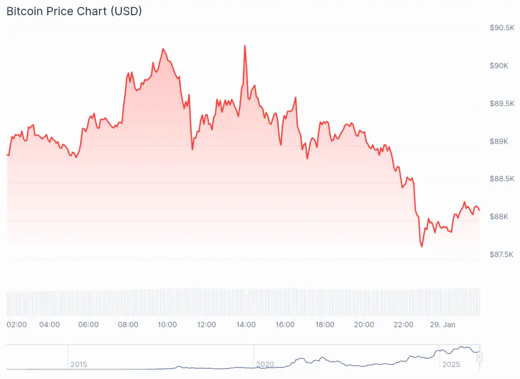 El mercado de activos digitales exhibió una notable resistencia durante la jornada del 28 de enero y mantuvo a la criptomoneda líder, Bitcoin, cotizando en un rango cercano a los 89.000 dólares. Esta estabilidad se produjo inmediatamente después de que el Comité Federal de Mercado Abierto de la Reserva Federal anunciara su resolución de conservar el límite superior de las tasas de interés en el 3,75%.
