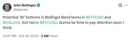 John Bollinger, creador de las Bandas de Bollinger, ha emitido una de sus escasas predicciones sobre esta criptomoneda. Según sus declaraciones compartidas en redes sociales, Ethereum y Solana muestran una estructura de piso en “W” dentro de sus respectivas bandas, lo que sugiere que ambos activos podrían estar cerca de iniciar un nuevo ciclo alcista.
