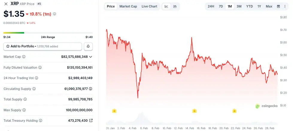 El desbloqueo de tokens XRP ocurre en un momento técnico delicado para la criptomoneda y el ecosistema cripto en general. Al cierre de esta edición, el precio de XRP cotiza en torno a los $1,38 dólares, enfrentando una corrección del 7% en las últimas horas y de más del 19% en el último mes.