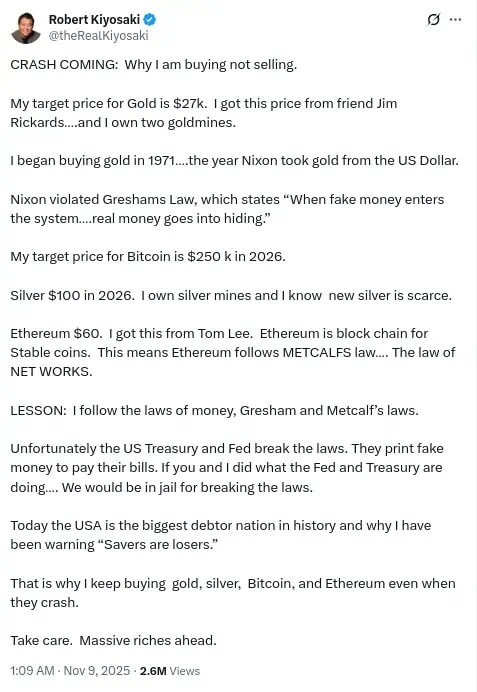 En su mensaje, Kiyosaki no solo reafirma su confianza en Bitcoin, sino que también proyecta un precio objetivo de 250.000 dólares para la criptomoneda en 2026. A esta predicción se suman estimaciones de 27.000 dólares para el oro y 100 dólares para la plata, activos que, junto con Ethereum, conforman su portafolio de protección patrimonial.