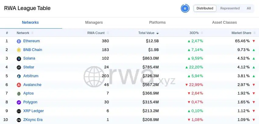 En términos de infraestructura, Ethereum mantiene su hegemonía en el sector RWA como la capa de liquidación preferida, concentrando aproximadamente el 65% de los activos emitidos. No obstante, la necesidad de menores costes operativos y mayor velocidad de finalización ha beneficiado a redes alternativas como Solana, Avalanche, Polygon y Arbitrum, que han absorbido una cuota de mercado significativa, según datos de RWAxyz.