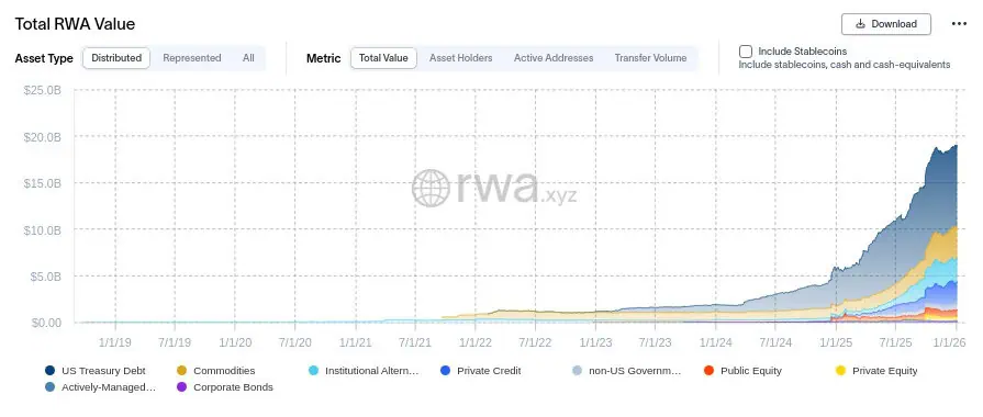 Los protocolos de Activos del Mundo Real (RWA) han superado en capitalización a segmentos históricos como los intercambios descentralizados (DEX) y los puentes de liquidez, posicionándose oficialmente como la quinta categoría más grande por Valor Total Bloqueado (TVL). Según los datos consultados en plataformas de análisis como RWAxyz y DeFi Llama, los RWA alcanzaron la cifra récord de $19.000 millones de dólares, un salto cuantitativo respecto a los $12.000 millones registrados en el cierre del cuarto trimestre de 2024.