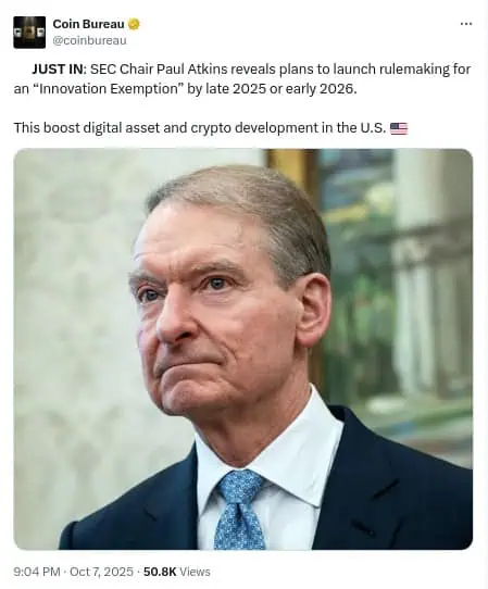 Paul Atkins, presidente de la SEC, ha dicho que la agencia trabaja actualmente en una exención regulatoria para impulsar la innovación cripto en EE.UU., con posibles avances normativos hacia 2026.