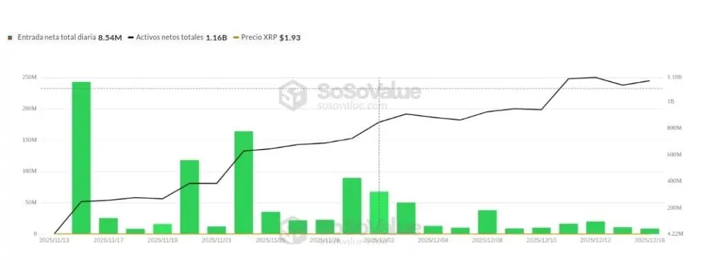 El dato más contundente que define el momento actual de XRP proviene de los fondos cotizados en bolsa. Según los registros recientes de SoSoValue, los ETFs de XRP han logrado superar la barrera psicológica y financiera de los 1.000 millones de dólares en entradas acumuladas.