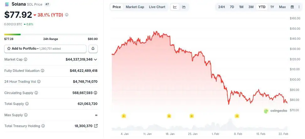 Actualmente, Solana se mantiene como la séptima criptomoneda por capitalización de mercado a nivel global, una posición que refuerza su relevancia dentro del ecosistema digital. Sin embargo, el comportamiento reciente del precio de SOL, con un retroceso cercano al 10% en la última semana y una caída acumulada de alrededor del 40% en lo que va de año, refleja un ajuste más amplio en los activos de alto crecimiento.