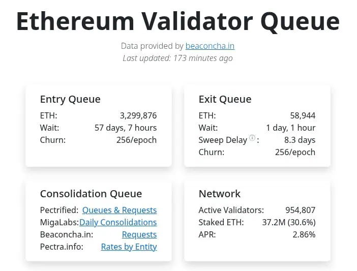 Para participar en el staking, cada nodo necesita depositar 32 ETH, un requisito que ha impulsado una ola de depósitos sin precedentes. La acumulación es tan grande que, incluso si no se añadieran más postulantes, el sistema tardaría casi dos meses en activar a todos los que ya están en espera.