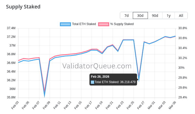 Según los registros de la plataforma de monitoreo ValidatorQueue, este flujo de activos elevó el total depositado a 37.221.855 de ETH, lo que equivale al 30,6% del suministro total en circulación.