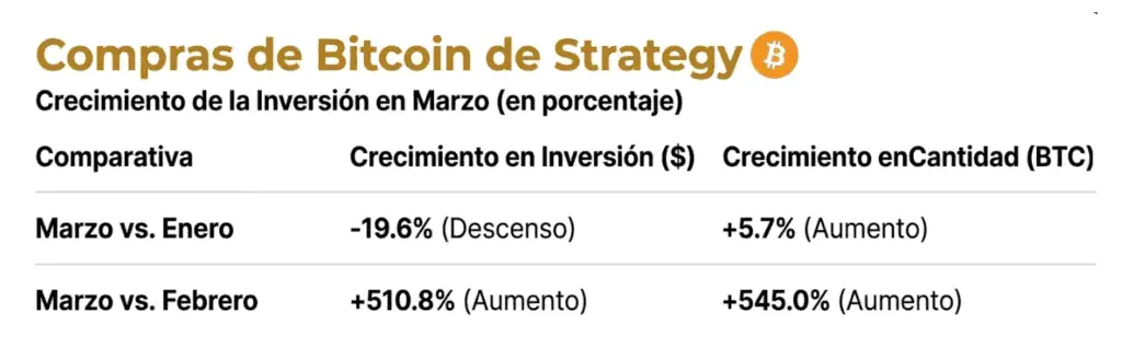Sin embargo, los datos de marzo indican un retorno a la agresividad financiera. Con una inversión aproximada de 3.054 millones de dólares en lo que va de mes, el crecimiento de la inversión en BTC respecto a febrero se sitúa en un 510%. Esta reactivación no solo iguala la actividad vista durante el mes de enero, sino que establece un nuevo techo operativo para la firma. En términos de volumen de unidades de Bitcoin, el incremento de marzo frente a enero es de solo el 5,7%, pero aún queda margen en el calendario del mes para que la cifra siga avanzando, lo que refuerza la idea de una estrategia de ejecución más afinada y eficiente.