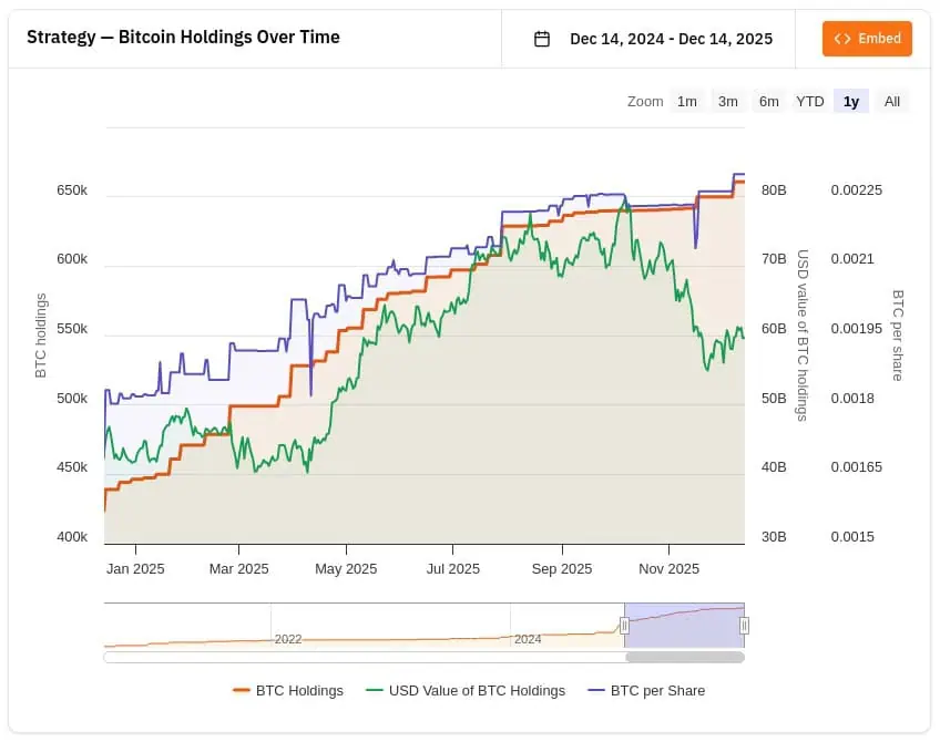 Según los datos más recientes de Bitcoin Treasuries, Strategy está cerrando el año con un aumento del 50% en sus tenencias de Bitcoin. Lo que comenzó en enero como una posición sólida de aproximadamente 420.000 BTC, se ha transformado, doce meses después, en una muralla financiera de más de 660.000 monedas. Sin embargo, lo más relevante no es solo el «cuánto», sino el «cuándo». La empresa ha demostrado una capacidad única para desacoplar su estrategia de acumulación del sentimiento bajista a corto plazo, aprovechando los descuentos de finales de año para engrosar su balance mientras otros venden.