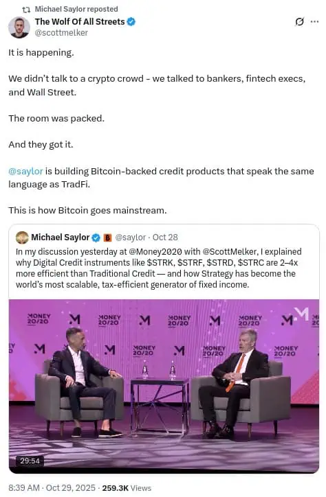 Durante el evento Money20/20, Michael Saylor dejó claro que Bitcoin ya no es solo una reserva digital o una apuesta de largo plazo. En conversación con Scott Melker, frente a una sala llena de ejecutivos de Wall Street, banqueros y líderes de fintech, Saylor presentó una visión concreta: Bitcoin está entrando en el corazón de las finanzas tradicionales, no como una alternativa, sino como una base para construir productos que hablan el mismo idioma que los mercados convencionales.