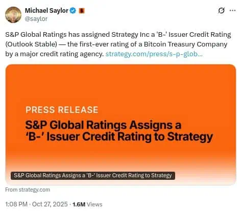 La reciente calificación crediticia de Strategy por parte de S&P Global Ratings refuerza esta tesis. El 27 de octubre, la agencia asignó una nota de “B-” con perspectiva estable, reconociendo por primera vez el papel de Bitcoin como garantía legítima en un modelo de deuda corporativa. Aunque la calificación se considera especulativa, marca un punto de inflexión: Bitcoin ha entrado formalmente en el mapa analítico de las finanzas convencionales, junto a bonos soberanos y préstamos respaldados por commodities.