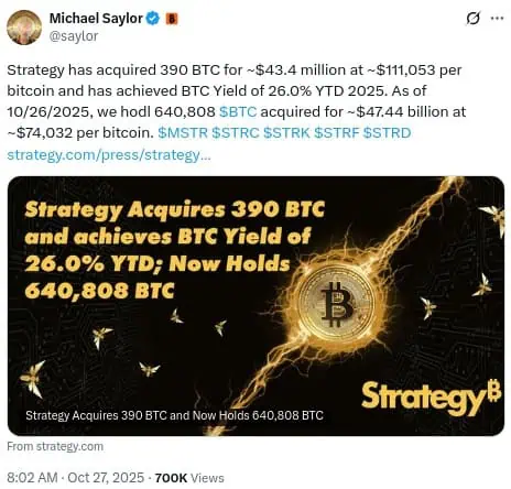 Pero, más que el tamaño de la compra de Bitcoin, lo que el ecosistema financiero analiza es el método y el momento. La transacción, realizada entre el 20 y el 26 de octubre, reafirma la política de acumulación sistemática de Strategy, enviando una señal de convicción inalterada a pesar de los niveles de precio actuales.