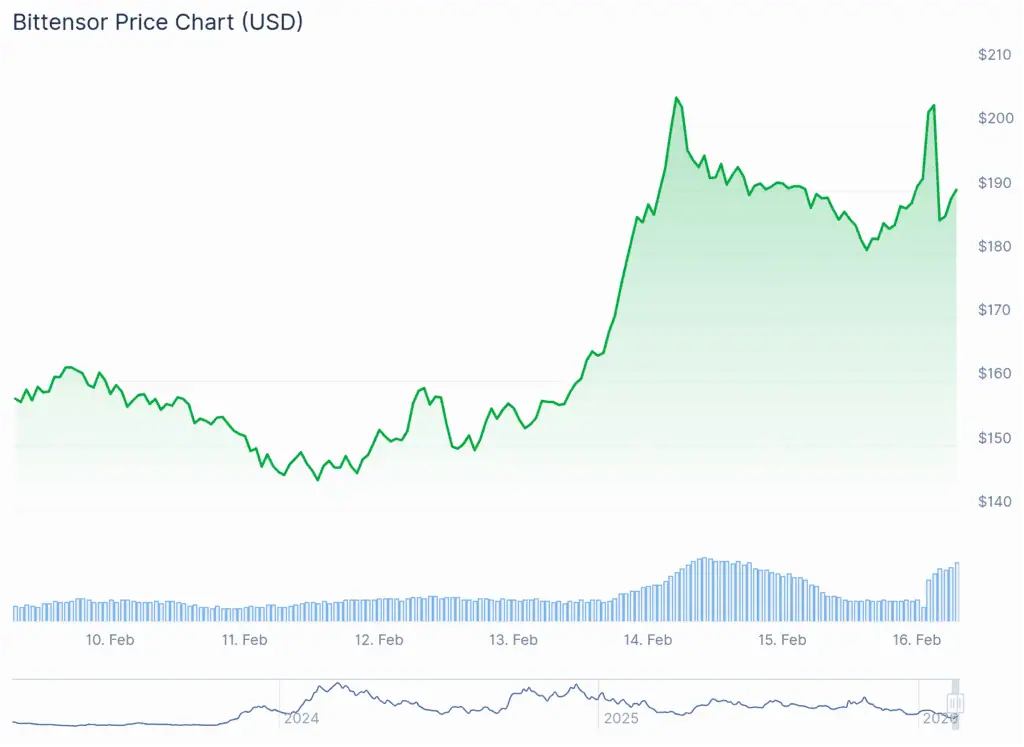 El desempeño reciente de Bittensor destaca en un tablero donde muchas altcoins luchan por mantener su relevancia. En la última semana, el precio de TAO pasó de niveles cercanos a los 160 dólares a negociarse en el entorno de los 190 dólares, marcando un crecimiento acumulado del 20,8%. Este repunte cobró fuerza a partir del 12 de febrero, cuando el sector de la inteligencia artificial cripto comenzó a mostrar señales de recuperación tras un periodo de contracción. La presión de compra se ha mantenido constante, elevando el volumen de negociación en 24 horas por encima de los 268 millones de dólares.