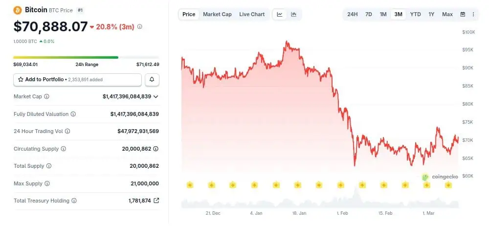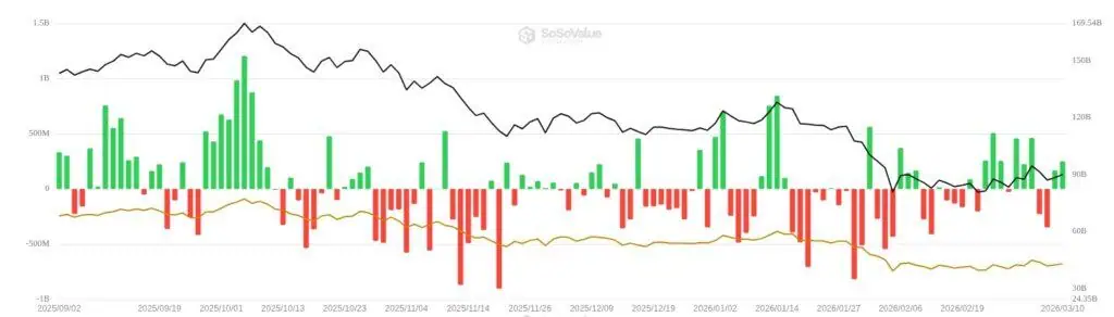 A pesar del complejo panorama exterior, el comportamiento de los inversores de gran escala muestra señales de resistencia. Según los registros de actividad de los fondos cotizados (ETF) de Bitcoin al contado, en lo que va de marzo se ha registrado una entrada neta de 1.560 millones de dólares. Esta cifra representa una reversión tras 4 meses consecutivos de salidas de capital de estos fondos, lo que indica que existe un interés institucional latente que busca aprovechar los niveles de soporte cercanos a los 68.000 dólares.