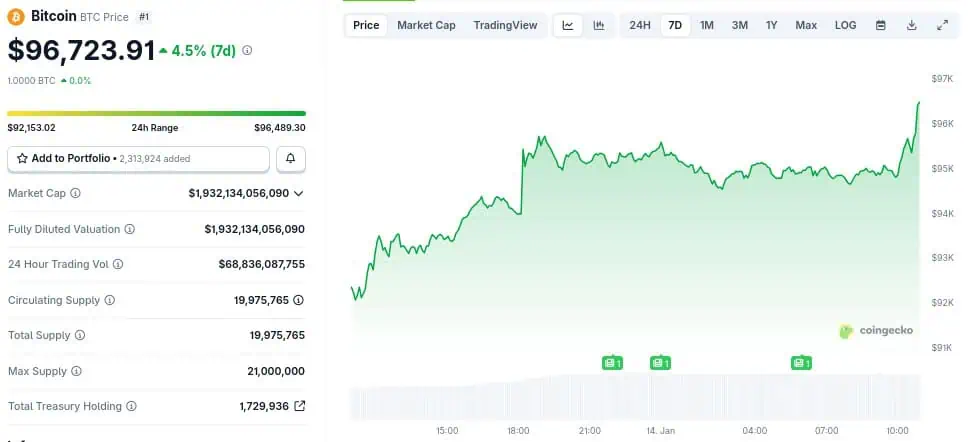 Bitcoin roza los 97.000 dólares este miércoles, 14 de enero, impulsado por la adopción institucional en Europa y la tensión política entre la Reserva Federal y la administración estadounidense.