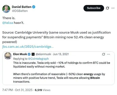 El dato fue recordado públicamente por Daniel Batten, analista y defensor de la sostenibilidad en el ecosistema cripto, quien citó directamente el compromiso que Musk había expresado en X. “Ya existe”, escribió Batten, refiriéndose al umbral energético que indicó el magnate, y subrayó que la fuente es la misma que Tesla usó para justificar la suspensión de pagos con Bitcoin en 2021: la Universidad de Cambridge. Sin embargo, hasta ahora, Tesla no ha retomado las operaciones de pago con la cripto líder ni se ha pronunciado sobre ello.