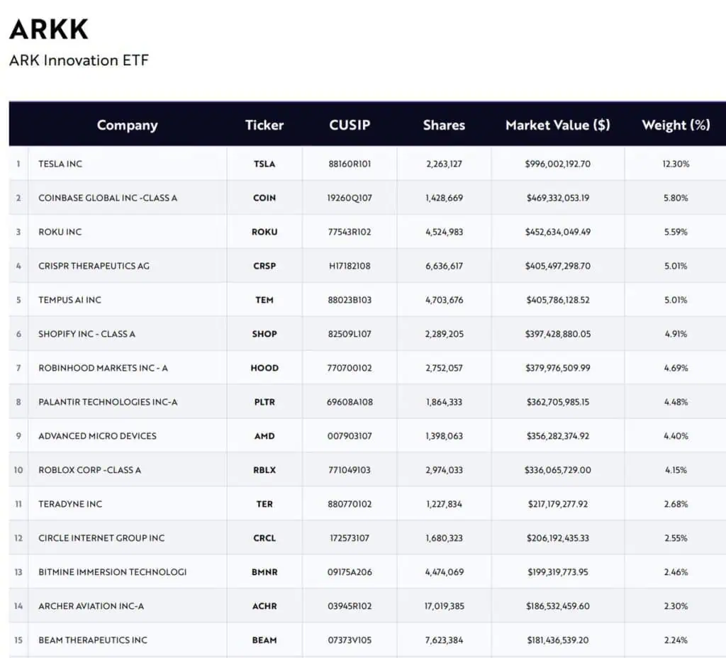 El fondo cotizado ARKK, reconocido por su enfoque en tecnologías disruptivas, destaca por incluir en su cartera a empresas líderes como Coinbase, Roku, CRISPR, Shopify, Palantir, AMD y Roblox. Aunque la presencia de Tesla no es una novedad, su posición predominante en la composición actual revela una estrategia clara y consistente, alineada con la visión de Wood, una gestora que se ha convertido en referente para la adopción institucional de Bitcoin y activos digitales.