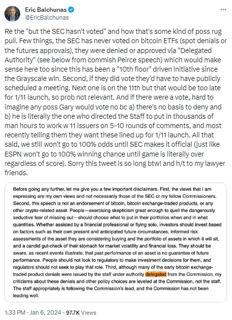 Según el experto en ETF de Bloomberg, Eric Balchunas, la SEC no ha votado y, posiblemente, no votará sobre la aprobación o rechazo de los ETF de Bitcoin.