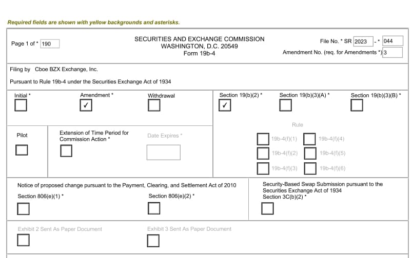 Las últimas presentaciones 19b-4 modificadas de los gestores de activos, como BlackRock, Grayscale y Fidelity, que buscan la aprobación de la SEC para lanzar un ETF spot de Bitcoin en Estados Unidos, han sido publicadas por las bolsas de comercio de valores en los que cotizarán estos fondos de inversión, en caso de ser aprobados.