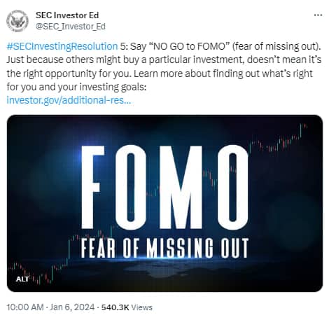 A través de X (antes Twitter), la SEC ha publicado una advertencia relacionada con el posible lanzamiento de los ETF de Bitcoin. Indicó que la posibilidad de acceder a una inversión en participar no significa que esta sea adecuada para todos los inversores, haciendo un llamado a no dejarse llevar por el FOMO, que significa “miedo a perderse de algo”.
