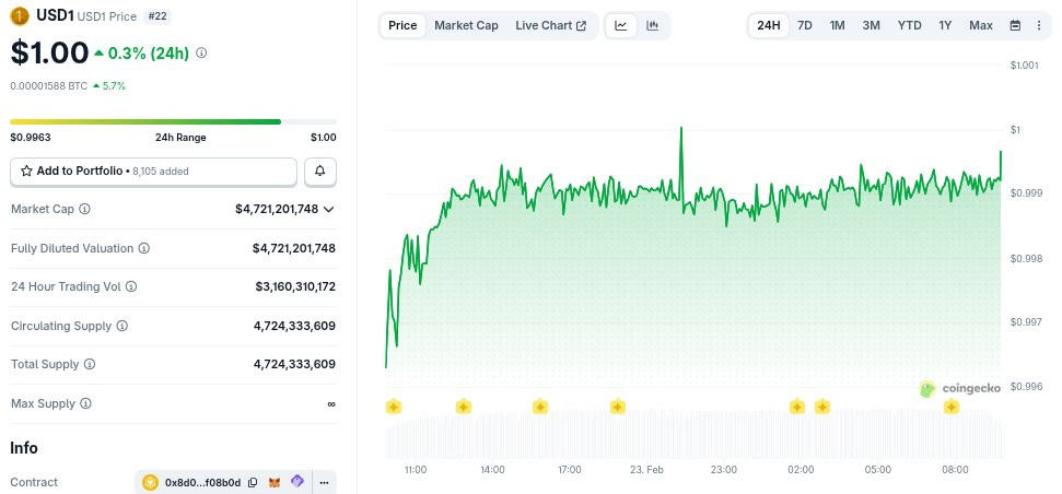 La moneda estable USD1 recupera el valor de 1 dólar tras un lunes de pánico.