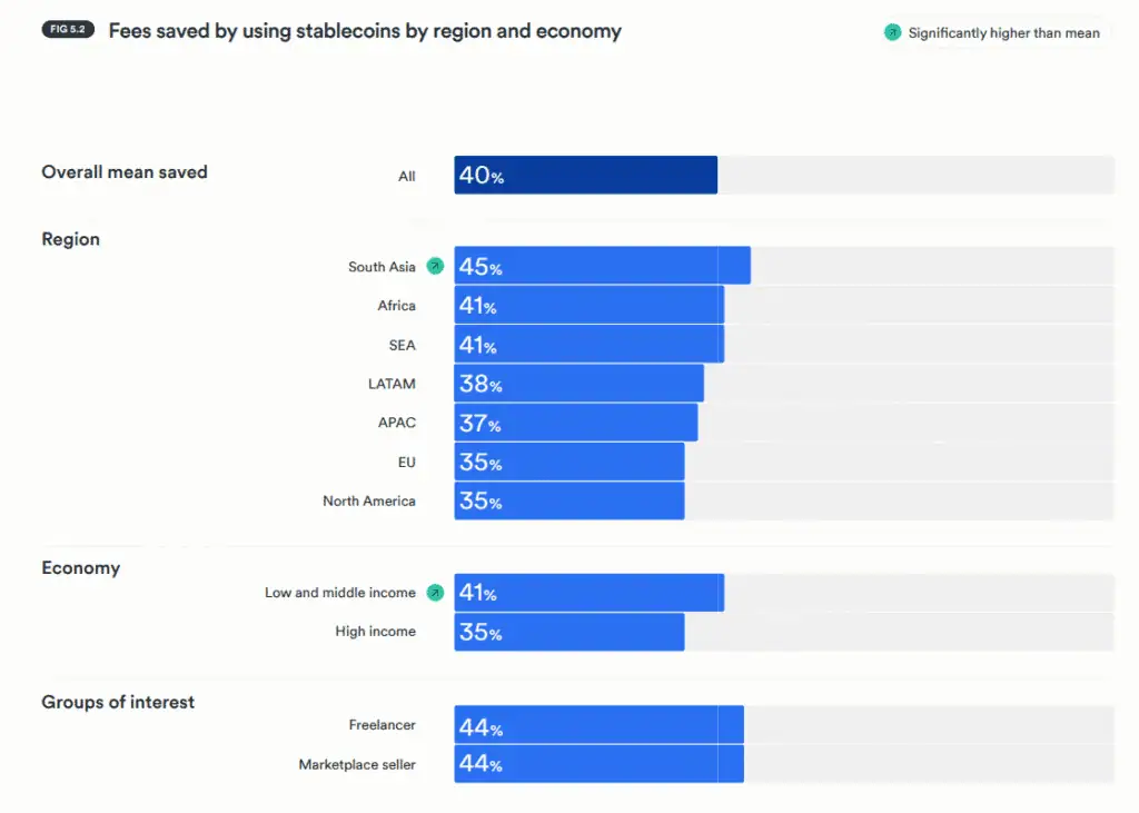 La adopción de las stablecoins como herramientas financieras muestra una segmentación clara según el contexto económico de cada región. De acuerdo con el informe citado, la propiedad de monedas estables es notablemente superior en las economías de ingresos medios y bajos, alcanzando un 60% de los encuestados, mientras que en los países de ingresos altos esta cifra se sitúa en el 45%.