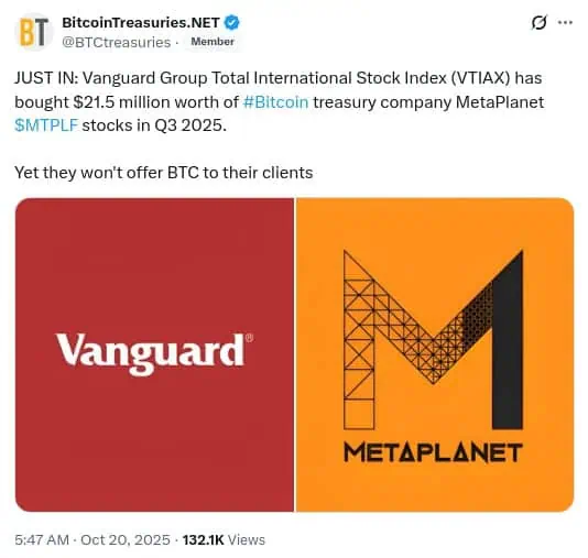 La plataforma de seguimiento de tesorería de Bitcoin, Bitcoin Treasuries, publicó una actualización que sacudió la narrativa institucional sobre las criptomonedas: Vanguard Group, el segundo mayor gestor de activos del mundo, reveló una nueva inversión de $21,5 millones en Bitcoin a través de su participación en Metaplanet Inc. durante el tercer trimestre.